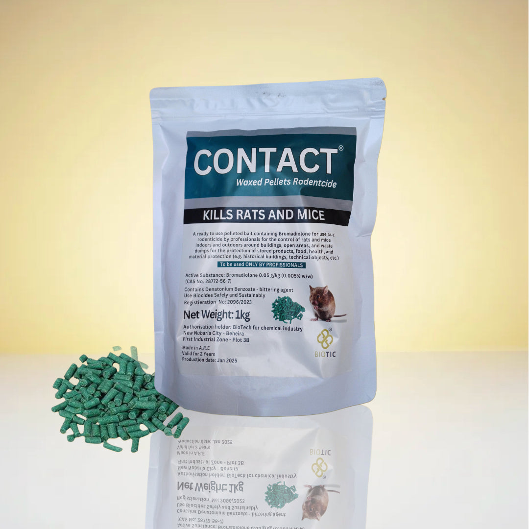 كونتاكت بيليتس شمع طعم فئران يأتي في صورة بيليتس علف مغلف بشمع، مصمم خصيصًا لجذب الفئران والقضاء عليها بفعالية، حتى في الأماكن الرطبة والبلاعات. يحتوي المنتج على 0.005% من البروماديولون، وهو مركب قوي يعمل على تعطيل نظام التخثر في الفئران، مما يؤدي إلى موتها بعد تناول الطعم.
