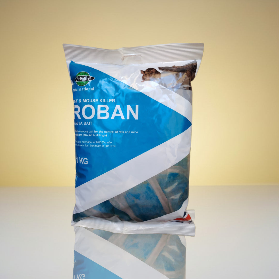 وصف المنتج: روبان هو طُعم فعّال وآمن للقضاء على الفئران، يحتوي على المادة الفعالة "difenacoum" بنسبة 0.005% w-w و"denatonium benyoate" بنسبة 0.001% w-w. تم تصميمه بعناية لضمان جذب الفئران والقضاء عليها بكفاءة عالية في المنازل، المزارع، المطاعم، والمستودعات.