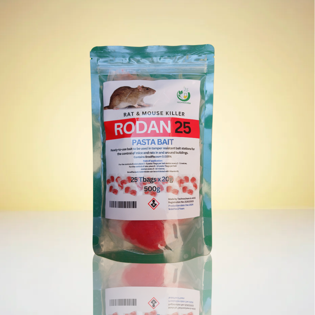 رودان هو طُعم قاتل للفئران فعّال وآمن، مصمم خصيصًا للقضاء على الفئران بكفاءة عالية. يحتوي المنتج على 0.005% من برودوفاكيوم، وهو مركب فعّال يعطل نظام التخثر في الفئران، مما يؤدي إلى موتها بفعالية. يتميز رودان بعدم القتل الفوري، مما يمنع الفئران من ربط الطُعم بالخطر، مما يزيد من فعالية المنتج.